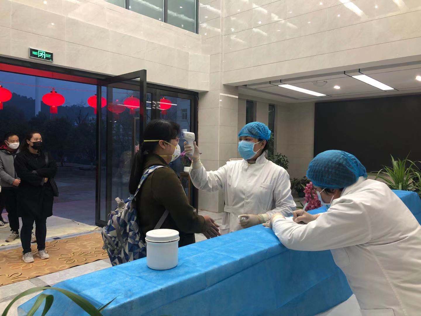 通過噴過消毒液的地墊、測(cè)體溫、雙手酒精消毒。
