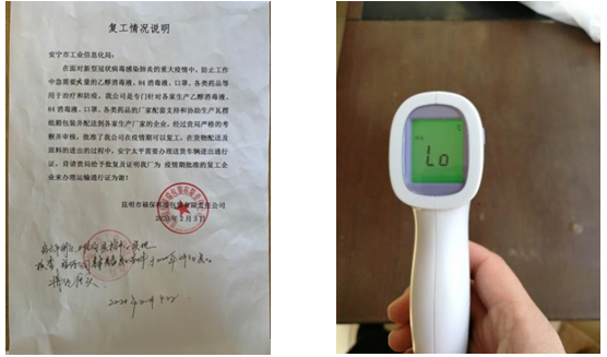 2月3日:1.安寧市工信局對(duì)福保祥瑞公司作準(zhǔn)予復(fù)工復(fù)產(chǎn)批復(fù),感到高興;2.安化社區(qū)借旭潤公司1支紅外線測溫儀使用。